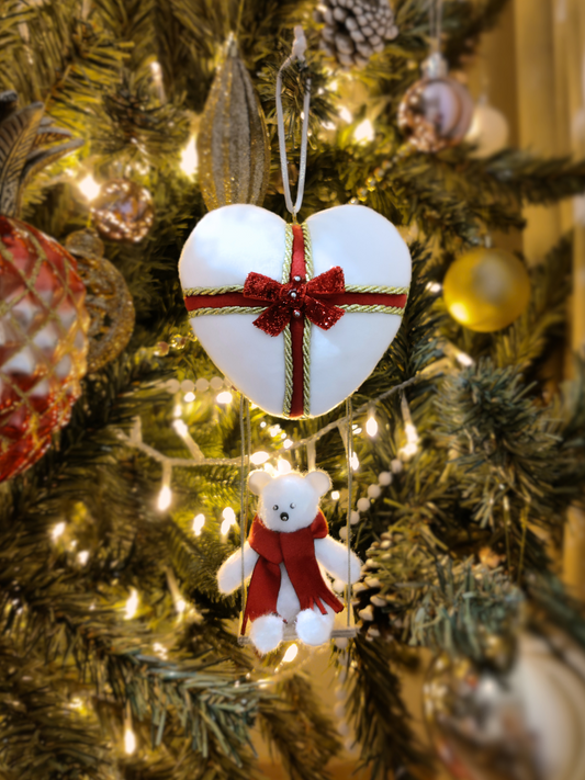 Rankų darbo eglutės žaisliukas "Meškiukas ant supynių"
