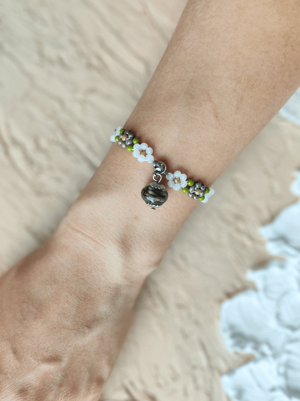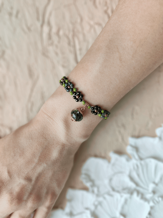 Čekiško stiklo karoliukų apyrankė su samanomis