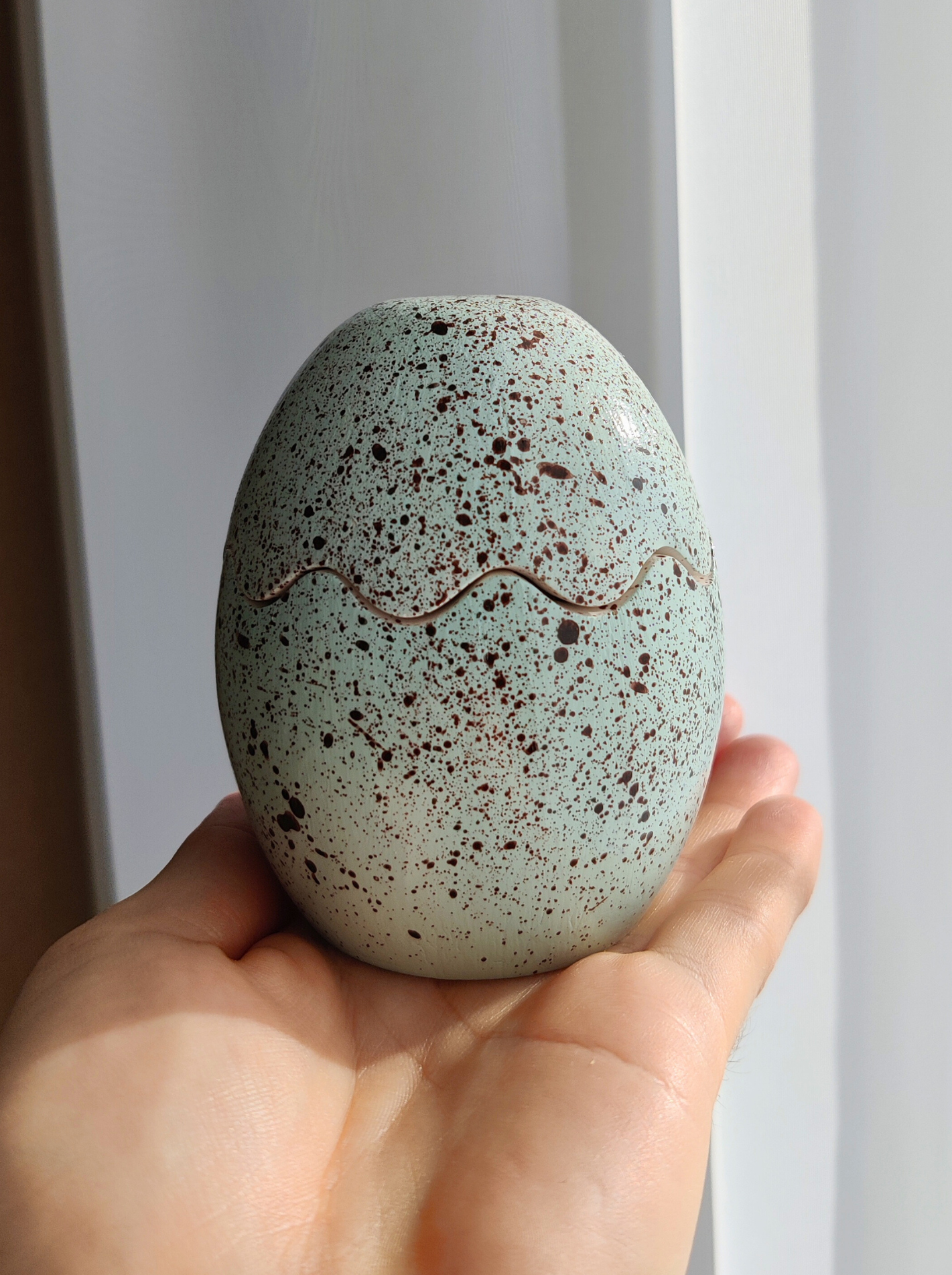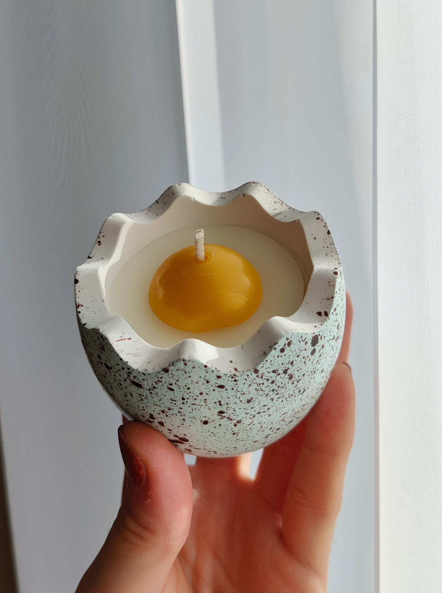 The candle is made from natural white and yellow beeswax and placed in a hand-poured gypsum container, carefully decorated with a quail egg-like pattern. The surface is covered with a glossy, heat-resistant varnish, which gives a subtle shine and protects the decor.