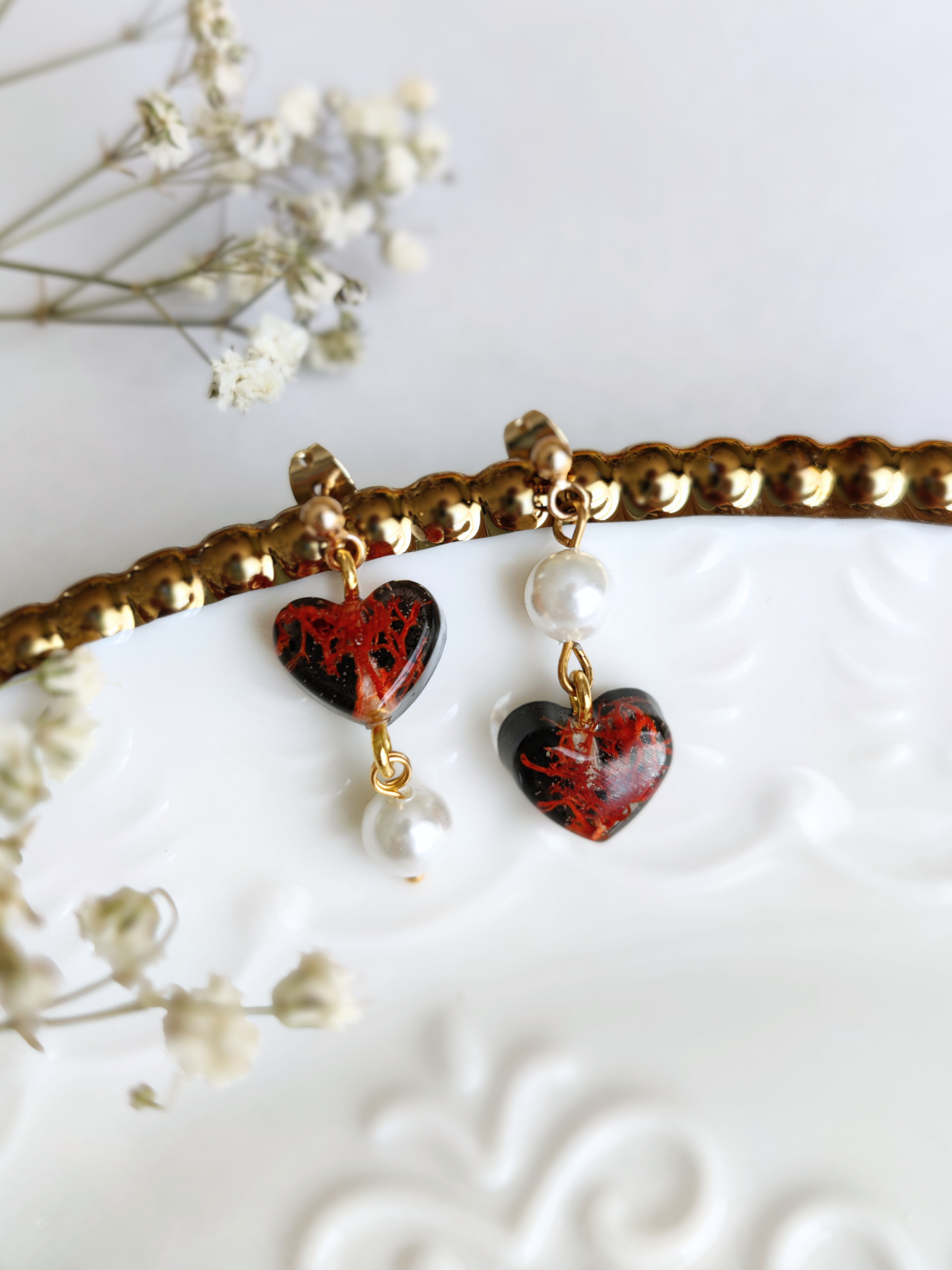 Rankų darbo auskarai su raudonomis samanomis ir perlų masės karoliukais.