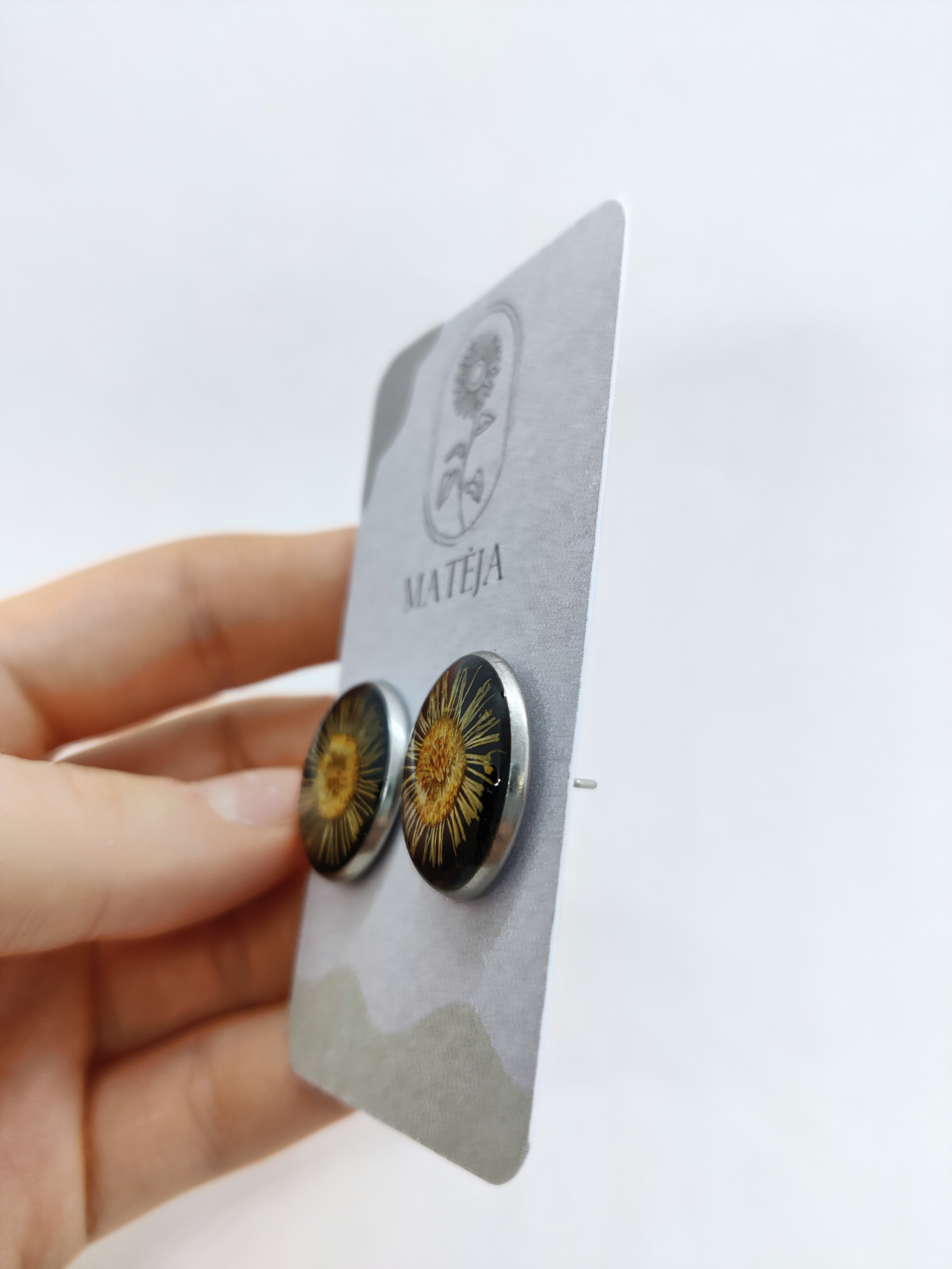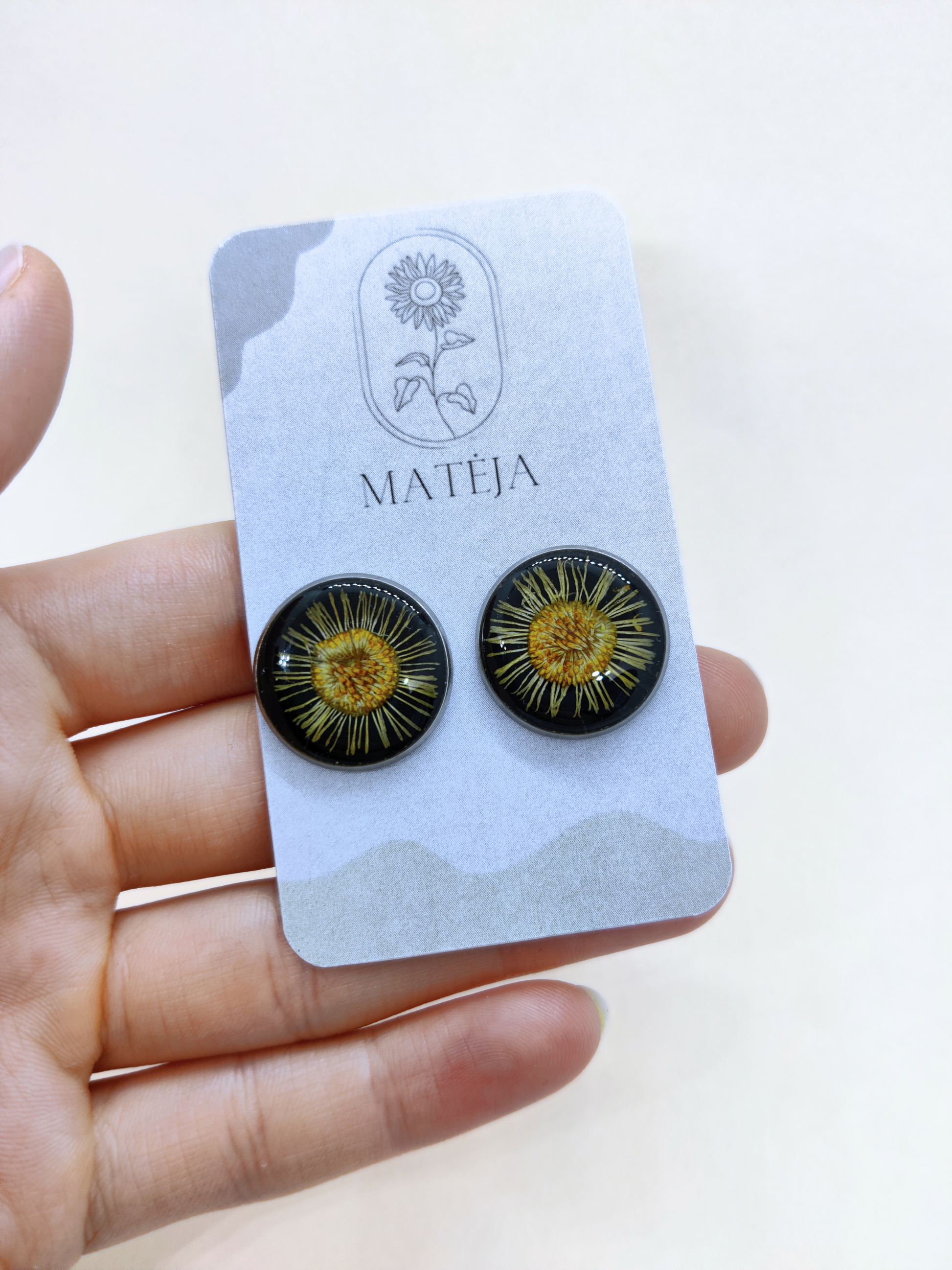 Rankų darbo auskarai su džiovintomis gėlėmis.