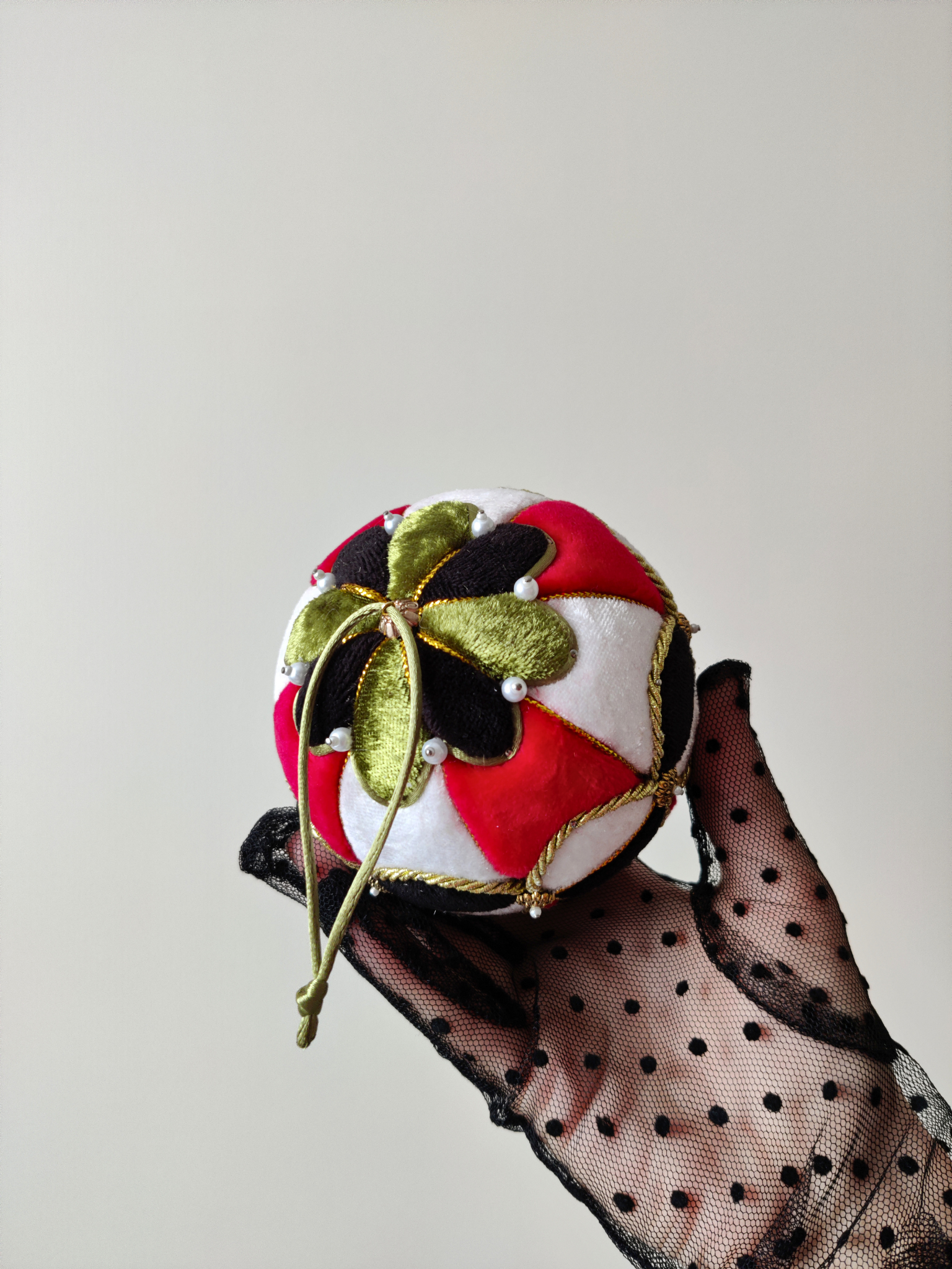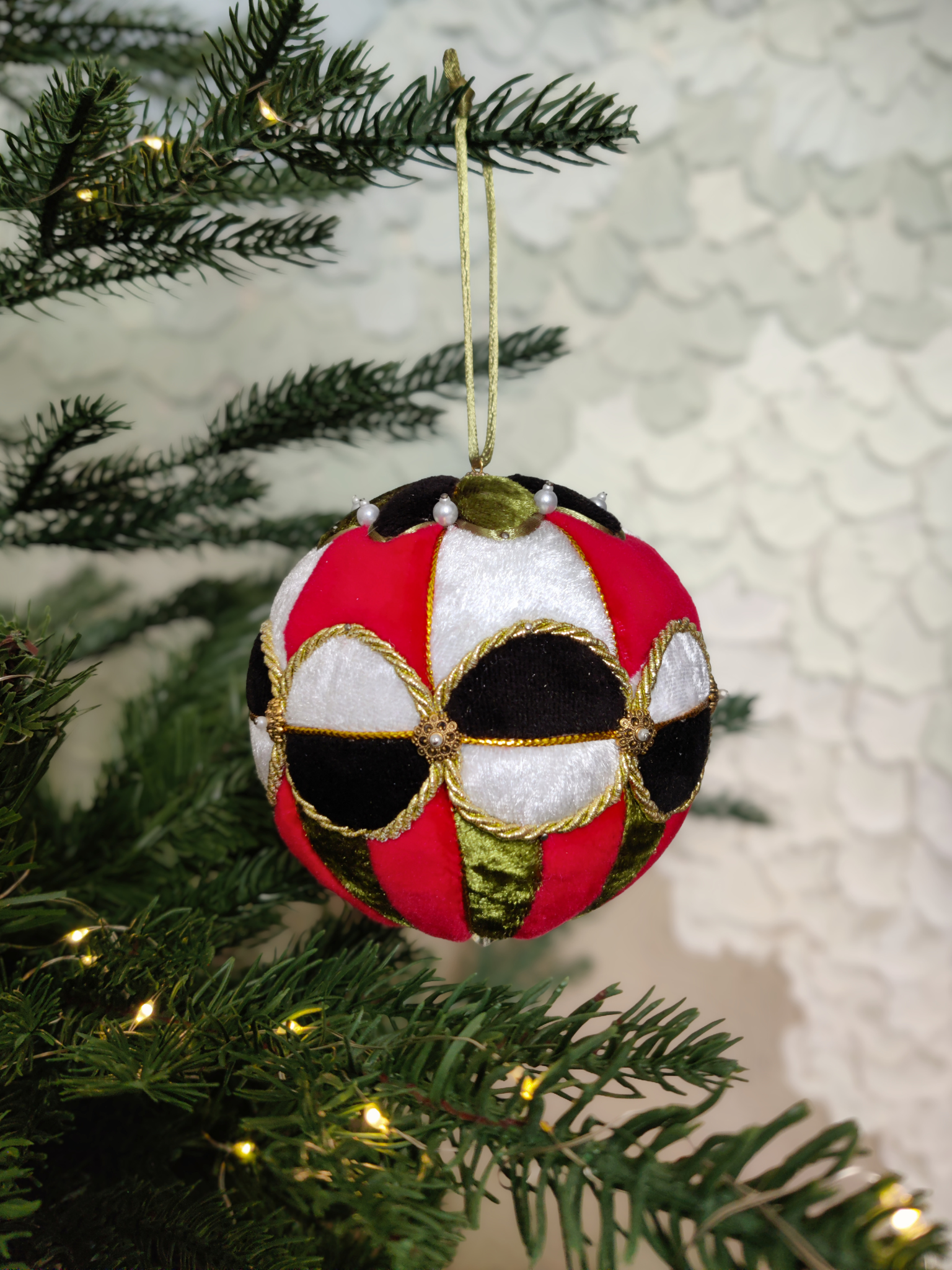 Išskirtinis rankų darbo eglutės žaisliukas, dekoruotas Kimekomi technika.