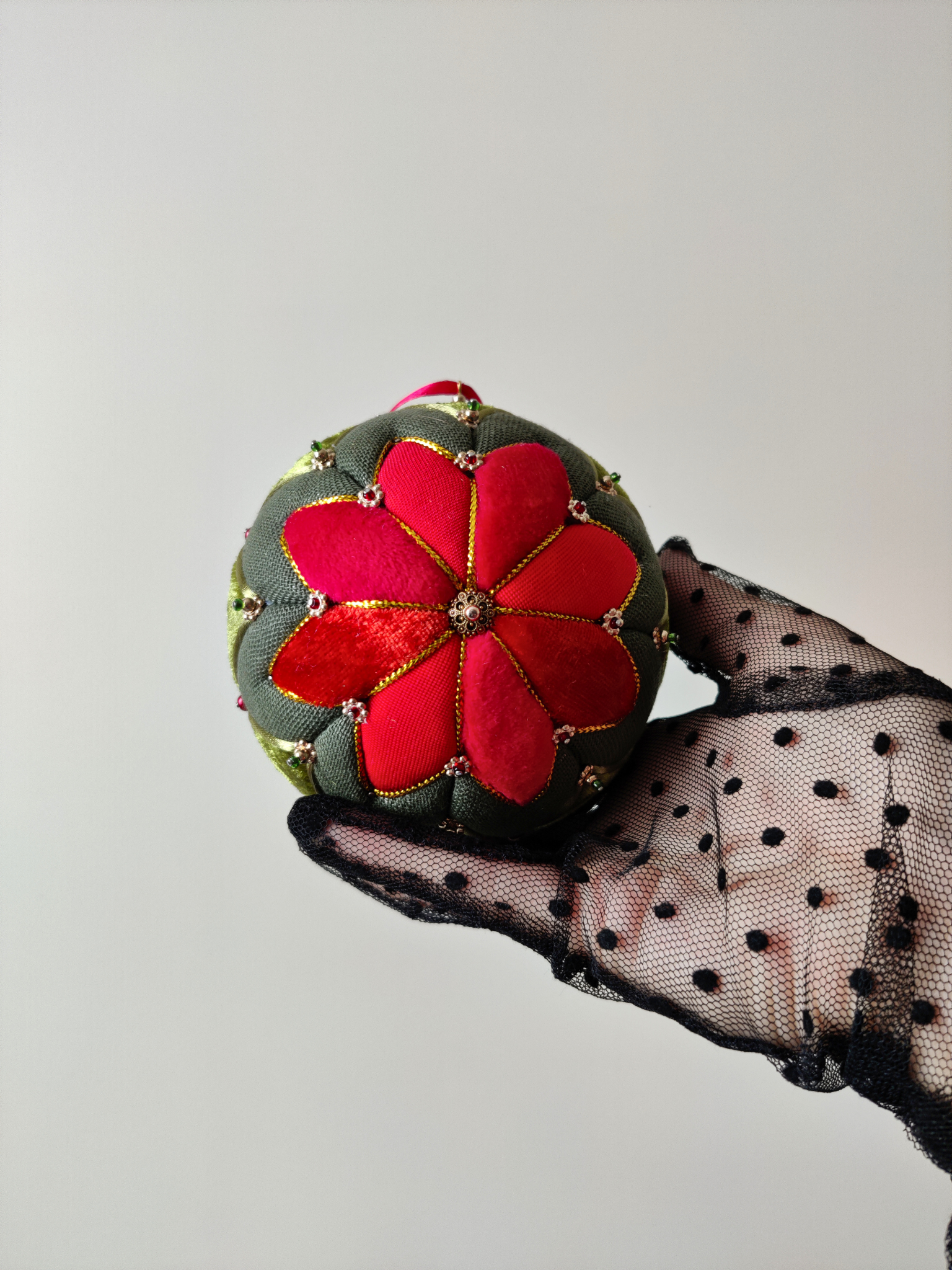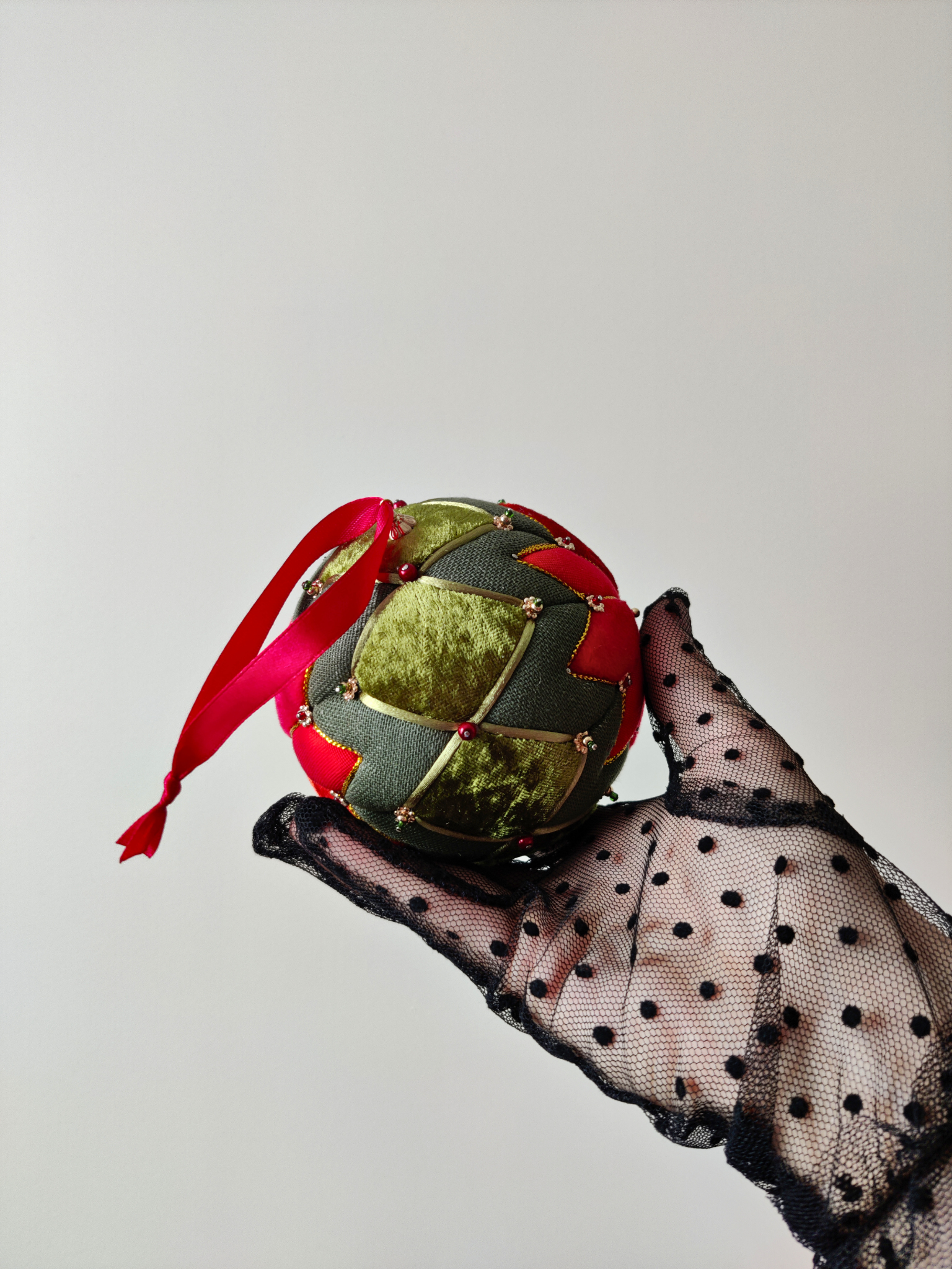 Išskirtinis rankų darbo eglutės žaisliukas, dekoruotas Kimekomi technika.