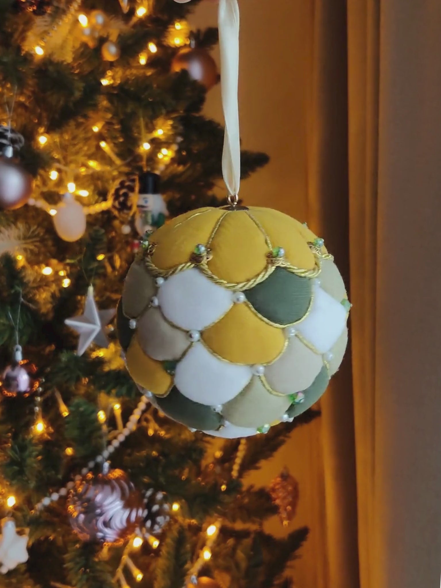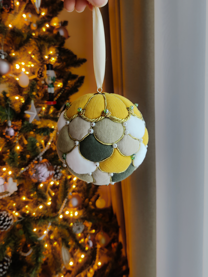 Vienetinis rankų darbo eglutės žaisliukas, dekoruotas Kimekomi technika.