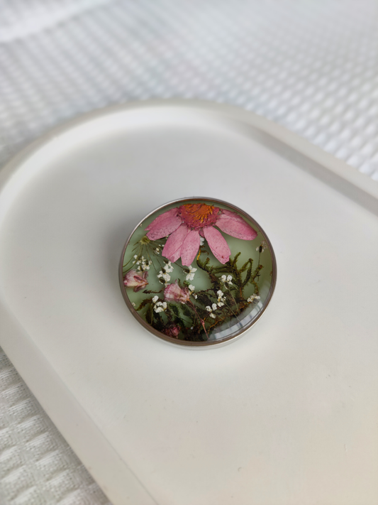 Vienetinė sagė su rožiniu žiedu ir samanomis
