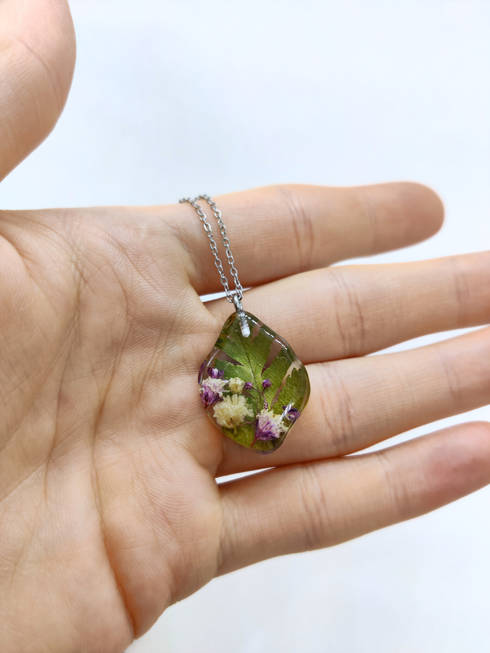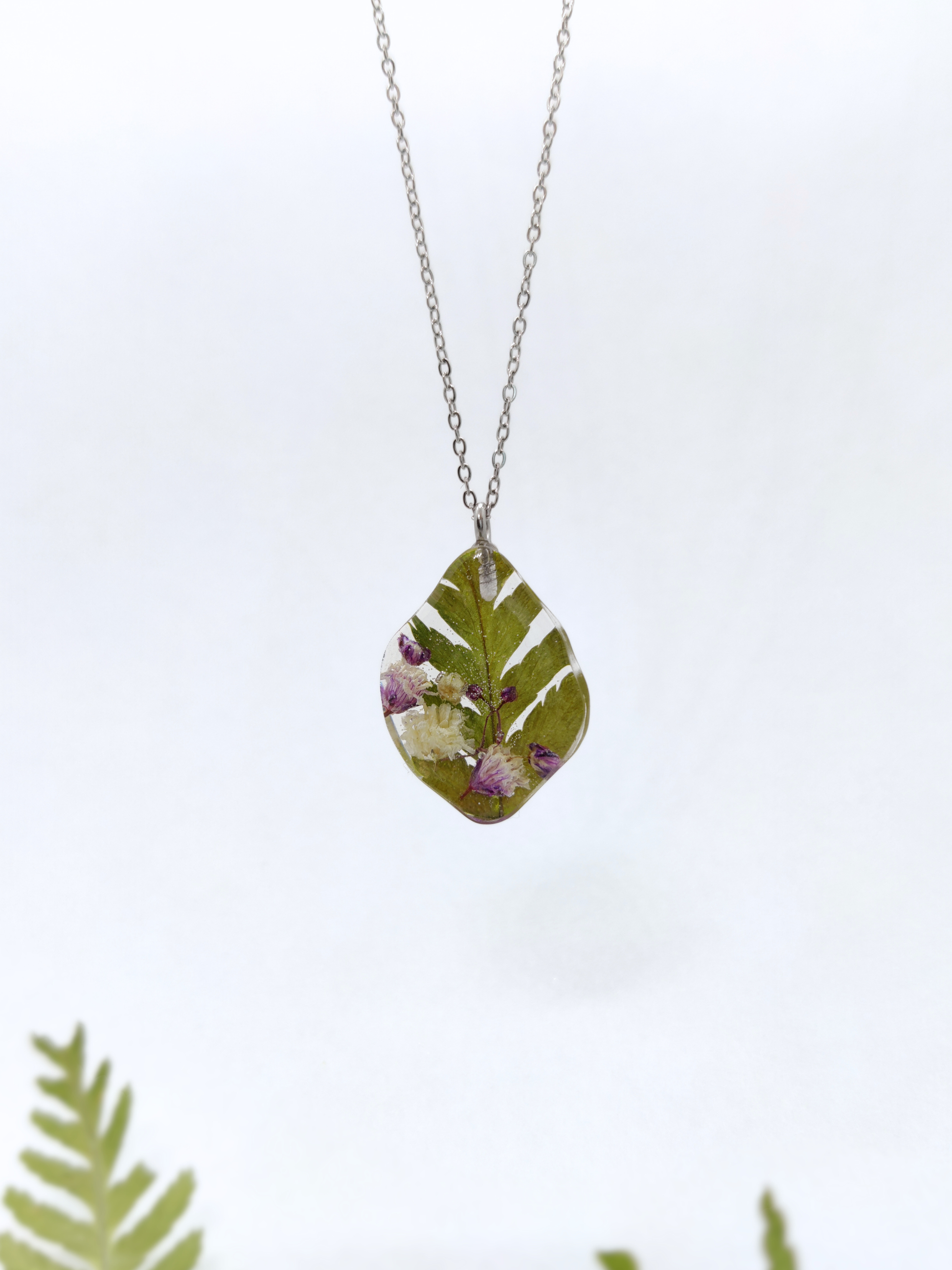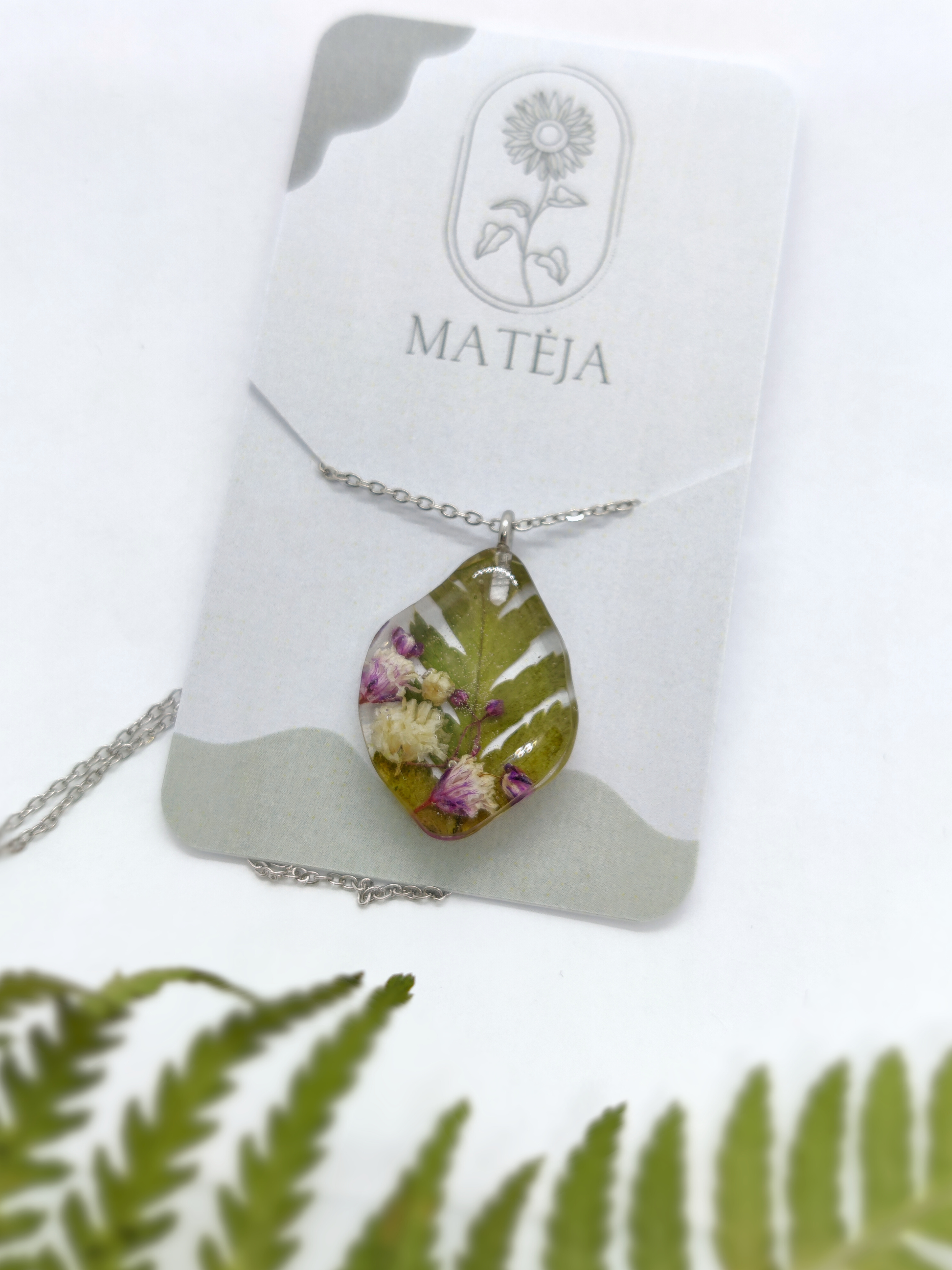 Išskirtinis, gamtos įkvėptas pakabukas, pagamintas iš skaidrios epoksidinės dervos, kurioje įamžintas džiovintos gipsofilijos ir paparčiai. Šis derinys kuria šiltą ir natūralų vaizdą – tarsi mažą gamtos fragmentą, kurį galima nešiotis visur su savimi.