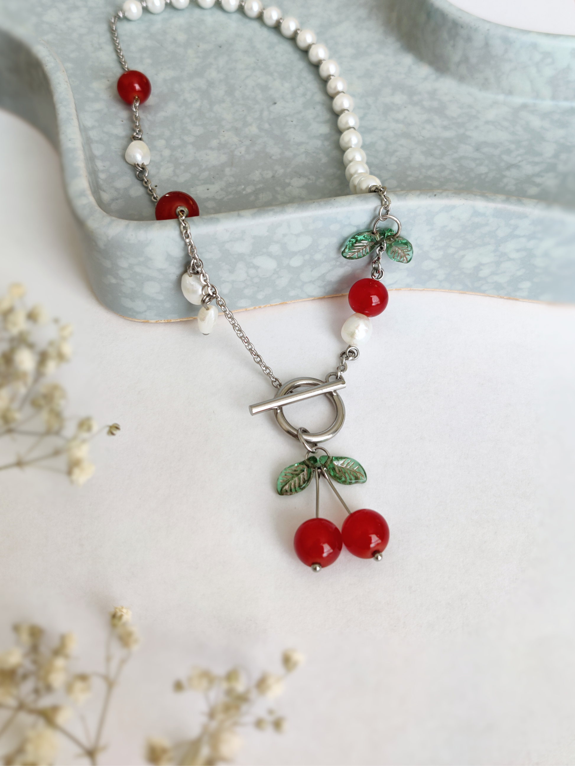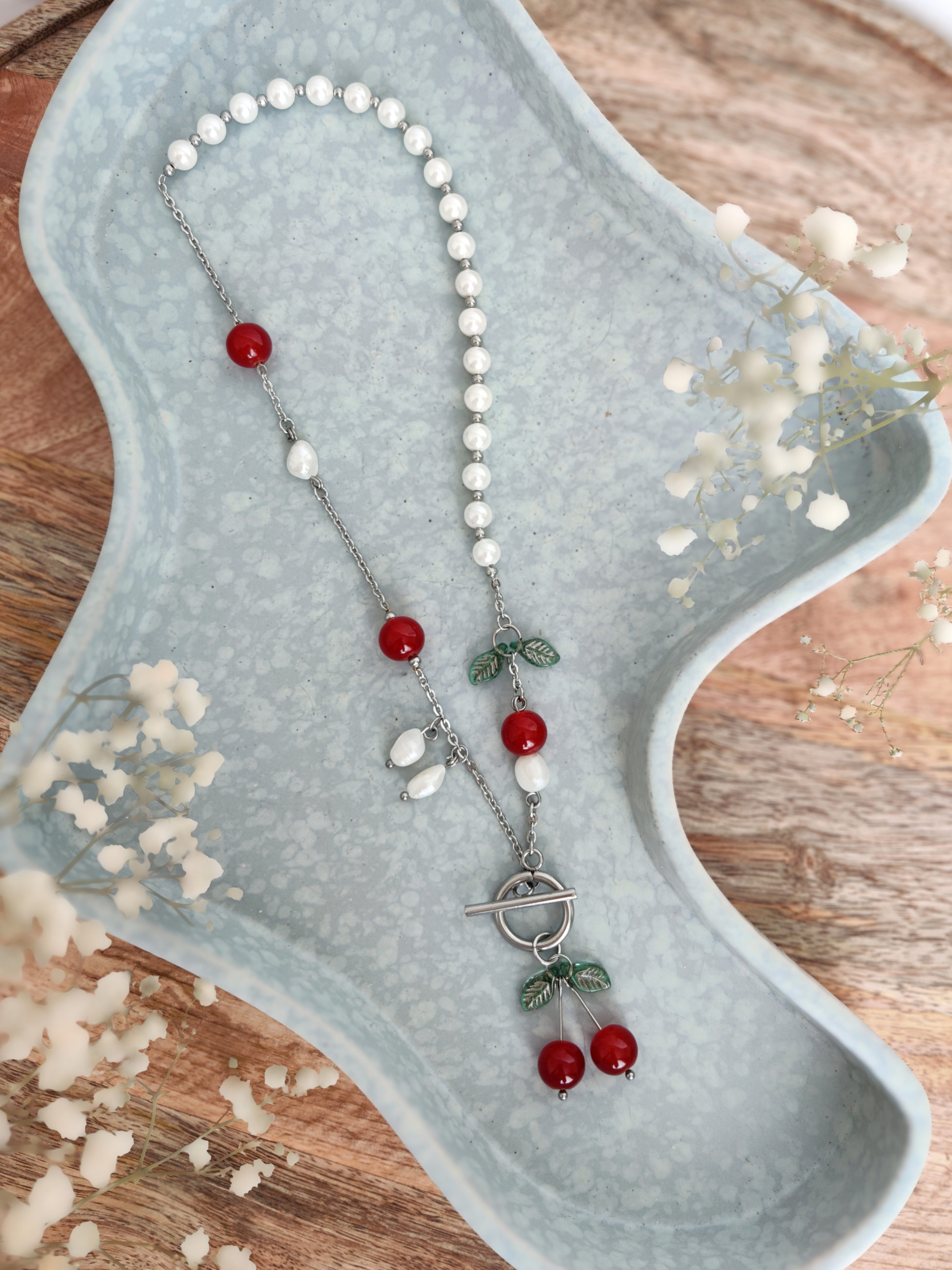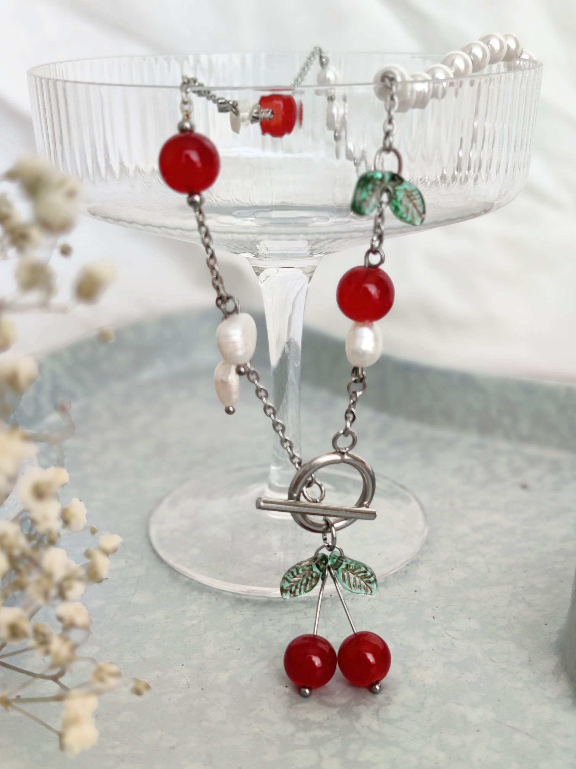 Vėrinys su stiklo ir gėlavandenių perlų detalėmis "Vyšnios"