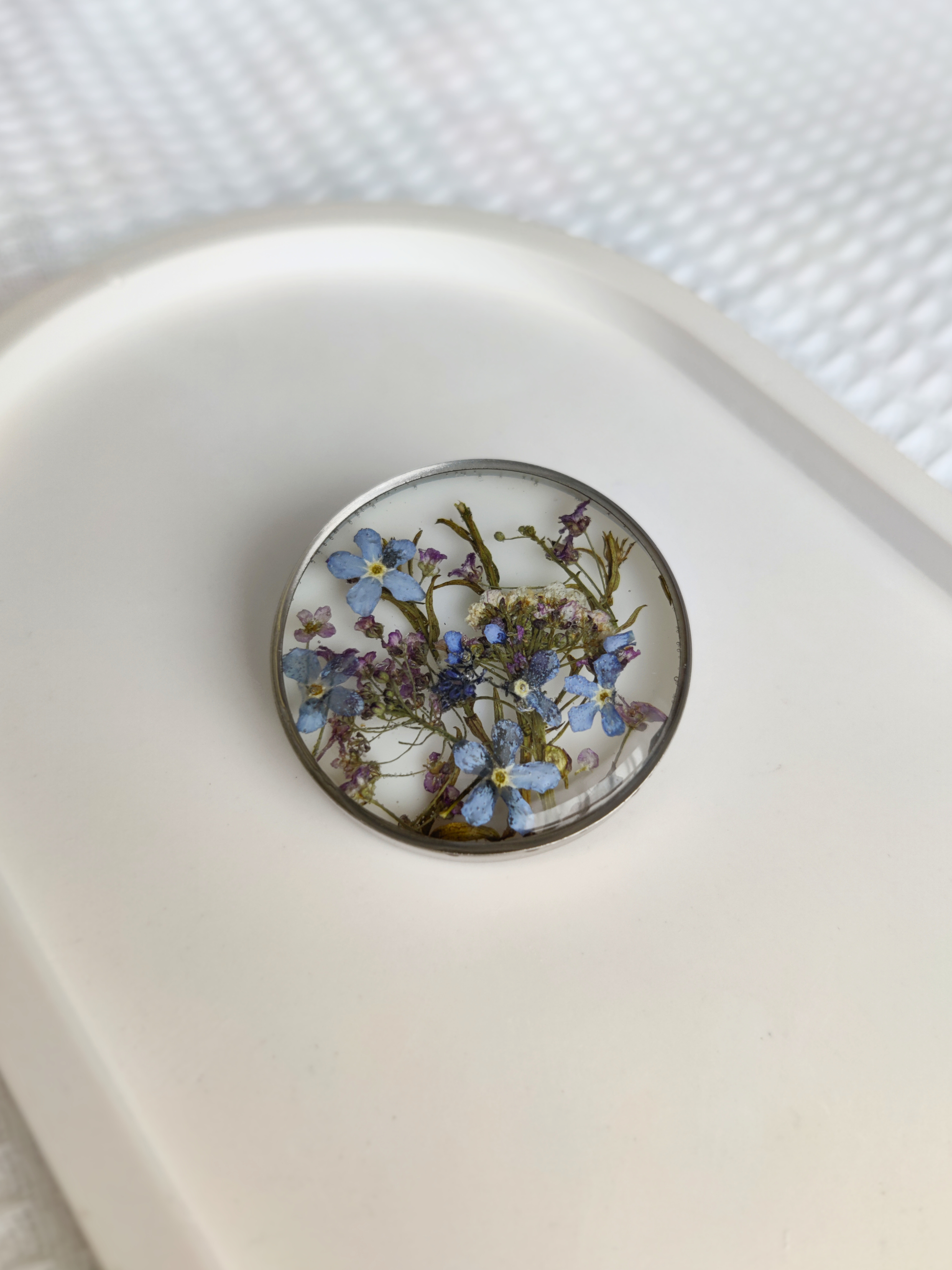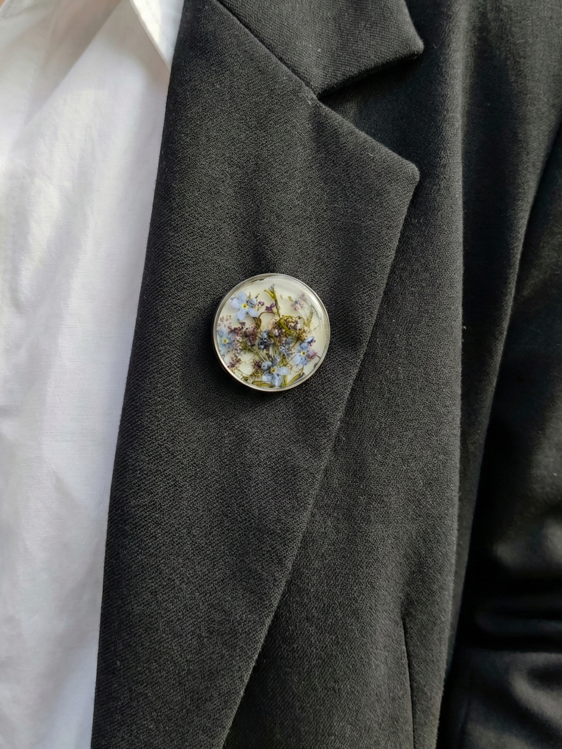 Rankų darbo vienetinė sagė su džiovintomis neužmirštuolėmis.