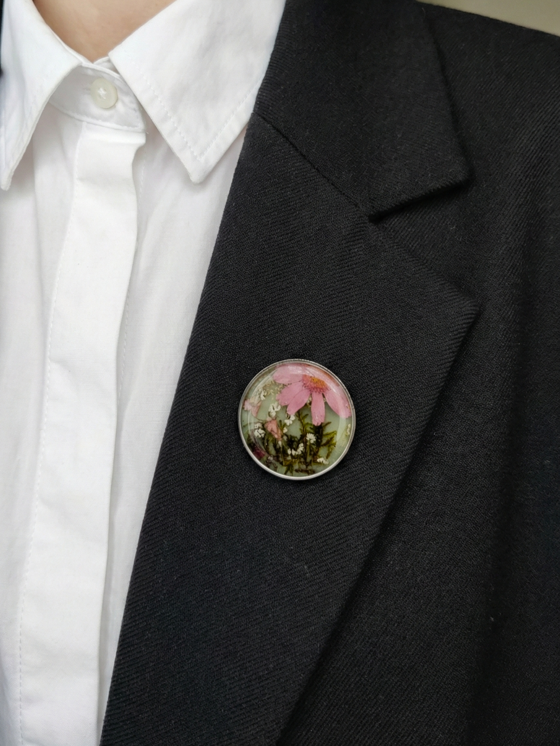 Vienetinė sagė su rožiniu žiedu ir samanomis